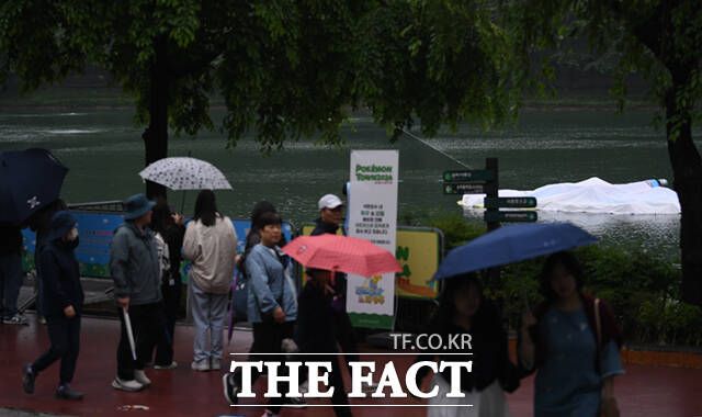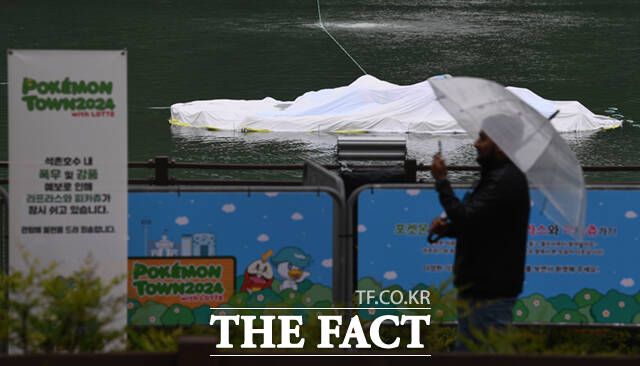 [더팩트ㅣ이새롬 기자] 어린이날 대체공휴일인 6일 서울 송파구 석촌호수 동호에 설치됐던 '라프라스&피카츄' 대형 아트벌룬이 궂은 날씨로 인해 바람을 빼고 전시를 중단했다.