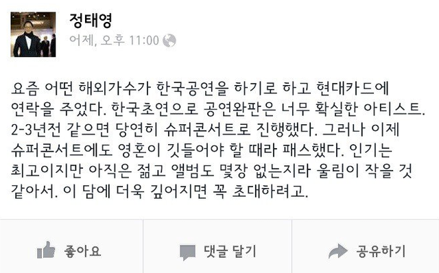 현대카드 슈퍼콘서트에서 공연하고 싶다는 세계적인 아티스트의 연락을 받았으나