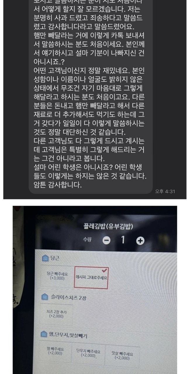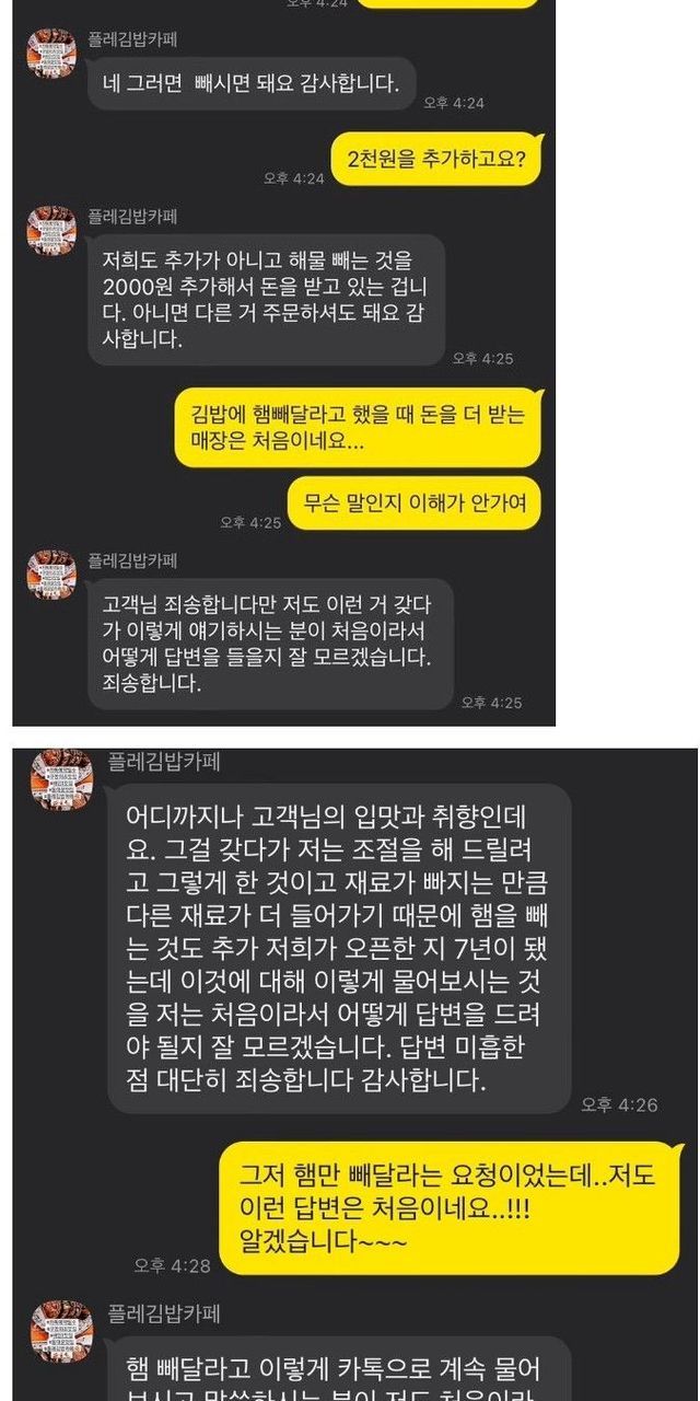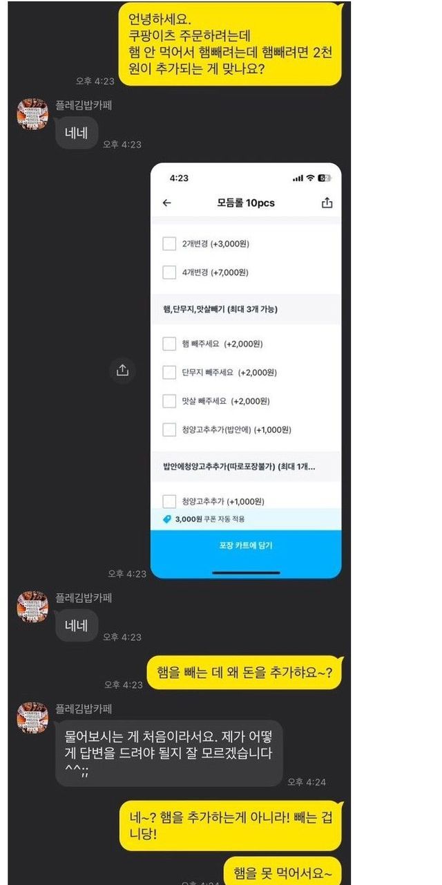 1. 김밥 주문하려는데 햄빼는 옵션이 2천원을 더 내는거라서(?) 사장님한테 문의