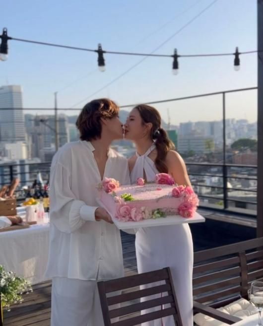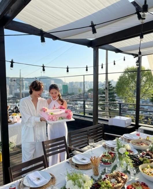 세븐이 공개한 사진 속에서 두 사람은 루프탑에 가든 파티 스타일로 음식을 차려놓고, 핑크 장미가 소복하게 장식된 케이크를 든 모습이다.