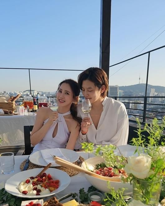 세븐은 하얀 셔츠, 이다해는 하얀 홀터넥 드레스를 입고 환하게 웃으며 1주년을 축하하고 있다. 또 다른 사진에서는 두 사람이 다정하게 어깨를 기댄 채 화이트 와인을 기울이며 달콤한 분위기를 자아낸다.