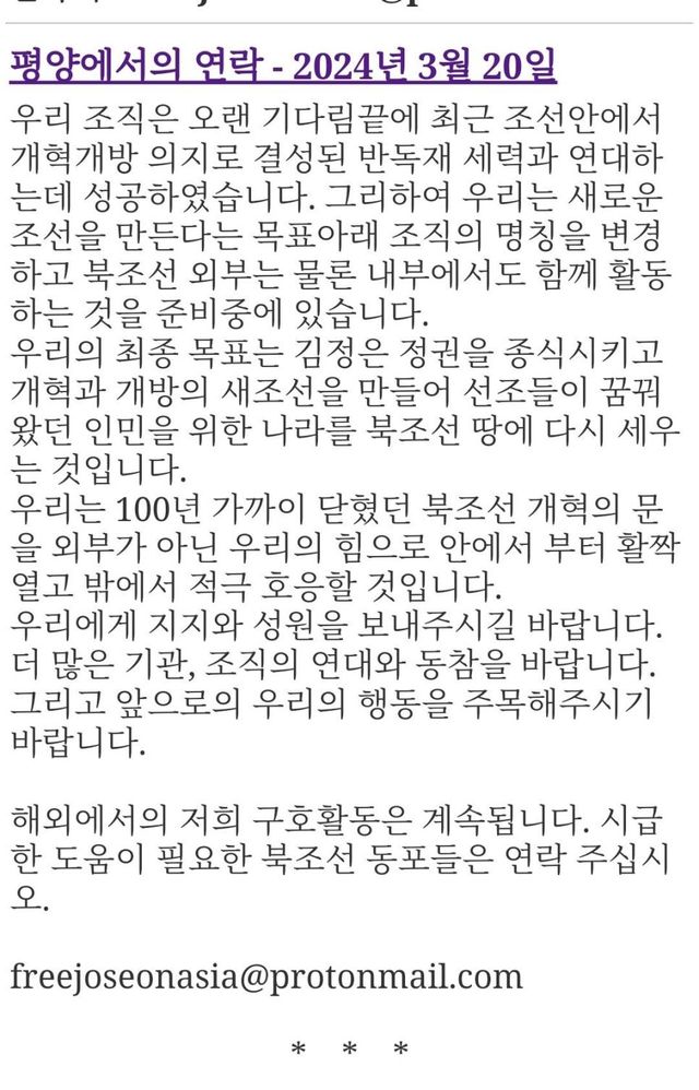 이미 북한 내부에 반독재세력이 있고그 세력과 연대하면서 공식적으로 발표를 하게 되었다는건북한 내부 시스템에 균열이 계속 생기고 있는 반증이지 않을까...