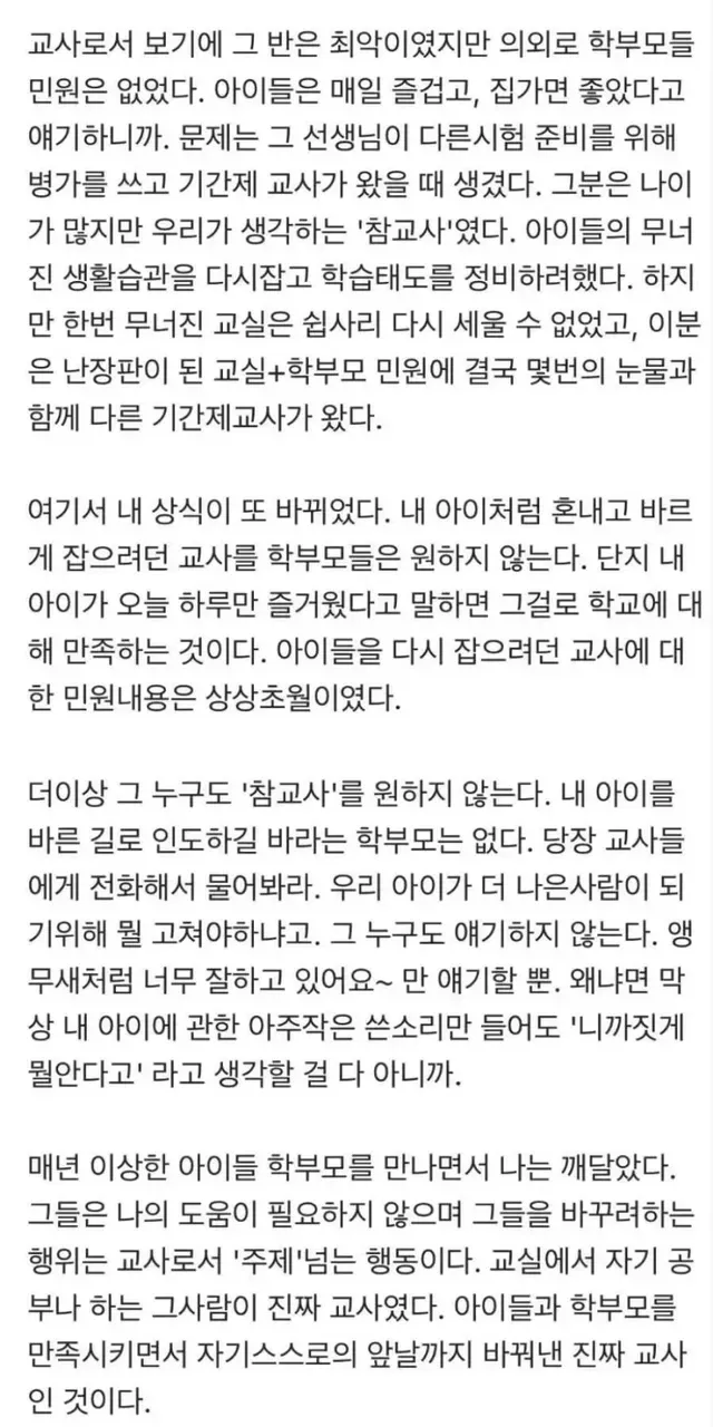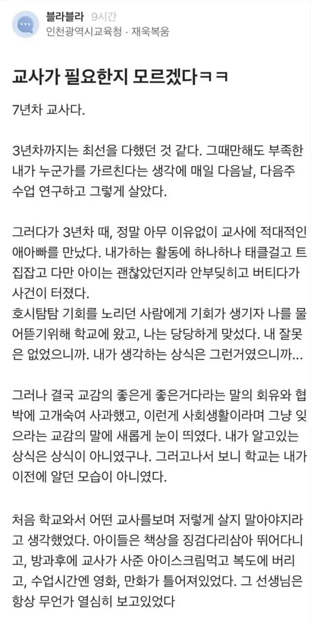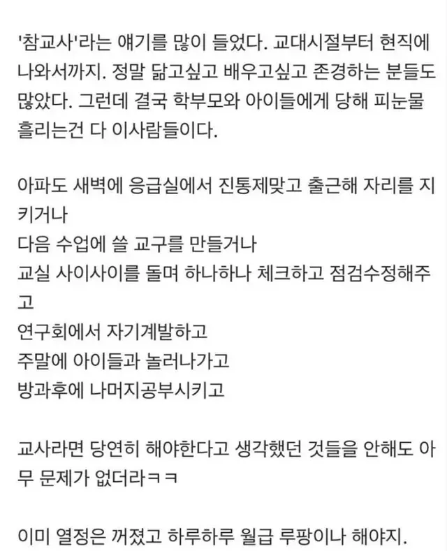 나는 그냥 직장인이라 생각한다. 교사라는 직업을 가진 월급쟁이 그이상 그이하도 아니다.'