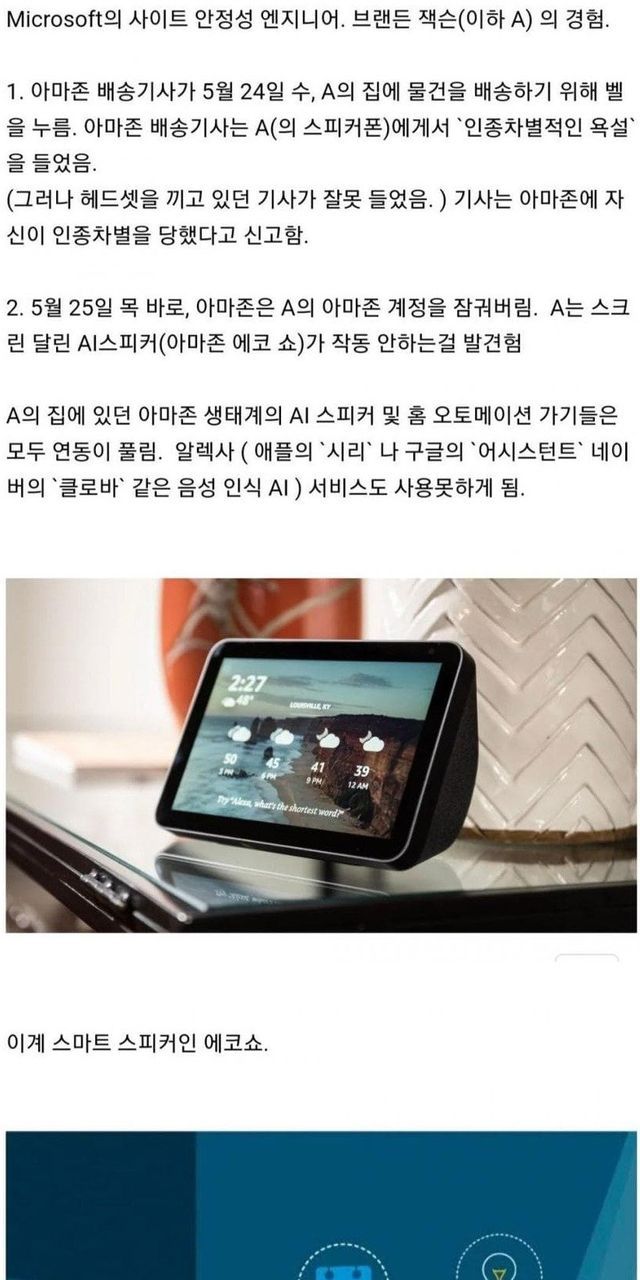 아마존에선 A씨의 아마존 계정을 잠궜고, 아마존 생태계의 AI 스피커 및 홈 오토메이션 기기들은 모두 연동이 풀림. 알렉사 서비스도 사용 못하게 됨.