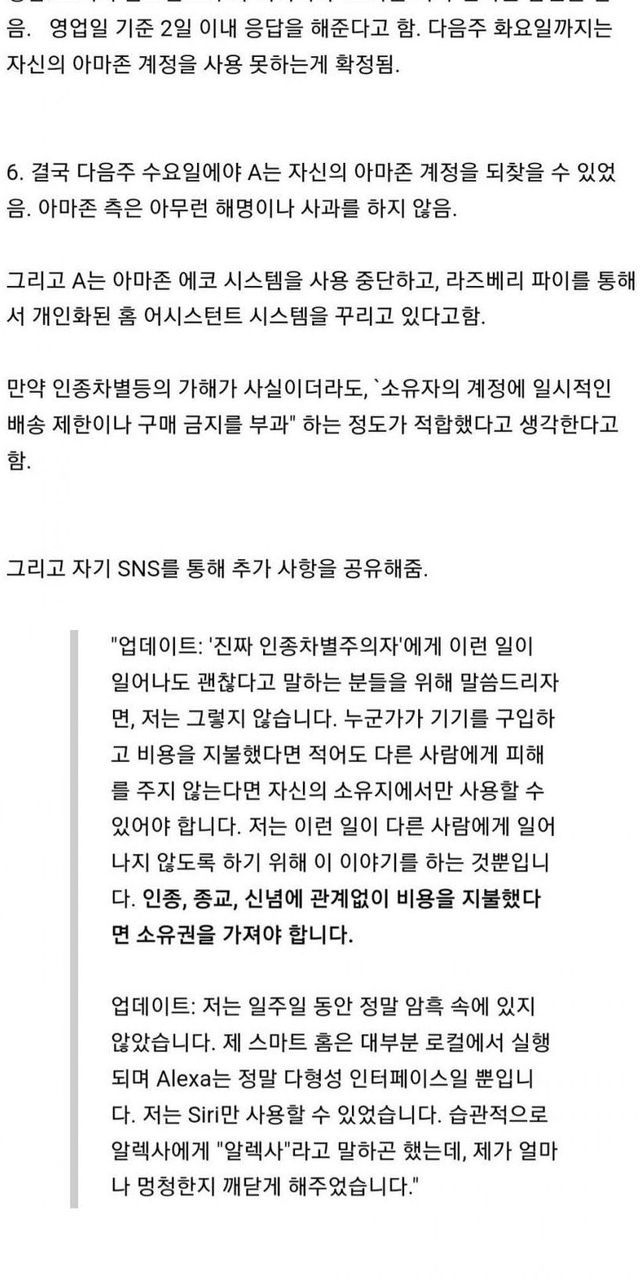 결국 A씨는 시간을 들여 인종차별을 하지 않았다는 것을 증명하고 정지를 풀었지만 아마존에게 사과 한 마디 못 들음.