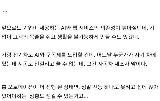 이 케이스에선 좀 불편해지는 걸로 끝났지만 앞으로 기술이 더 발전하면 기업이 고객의 목줄을 쥐게 되는 상황이 된다고 함.