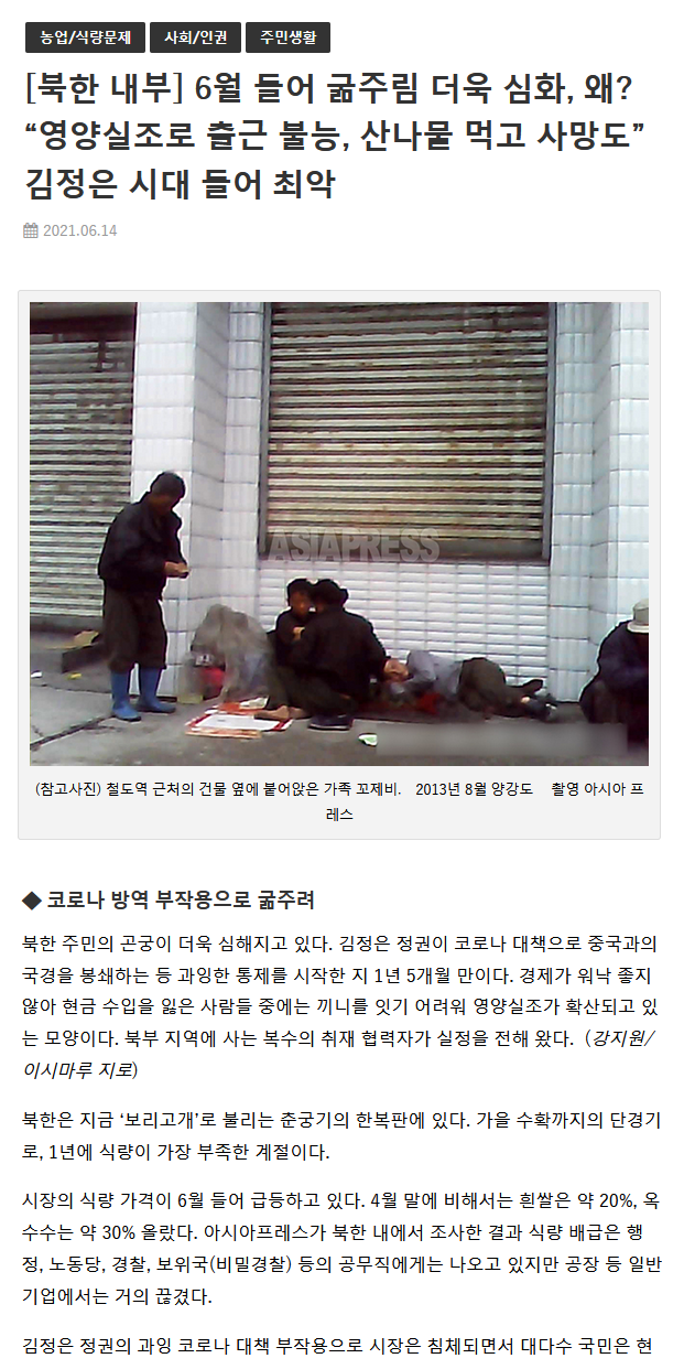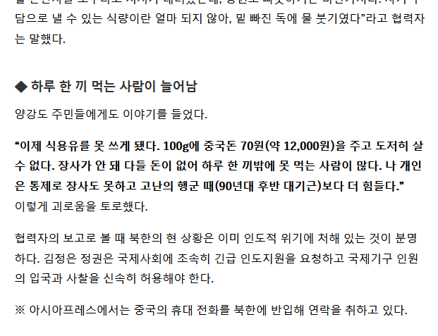 3. 식량 수입이 안되니까 곡물가격 폭등. 약품 수입이 안되서 결핵 사망자 속출. 중국과 장사 못하니까 돈을 못벌어서 거지되는 사람 늘어나는 중.