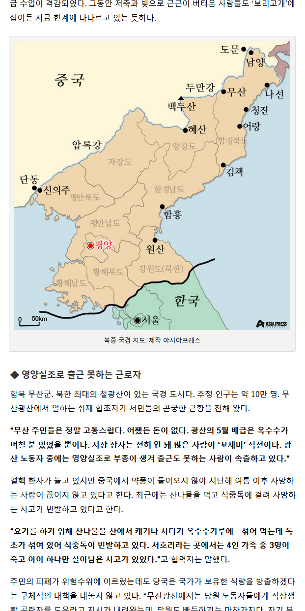 1. 북한은 식량자급률이 낮아서 보릿고개에는 식량을 중국산 수입에 의존함.