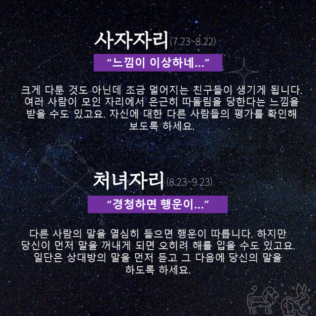 다른 사람의 말을 열심히 들으면 행운이 따릅니다. 하지만 당신이 먼저 말을 꺼내게 되면 오히려 해를 입을 수도 있고요. 일단은 상대방의 말을 먼저 듣고 그 다음에 당신의 말을 하도록 하세요.