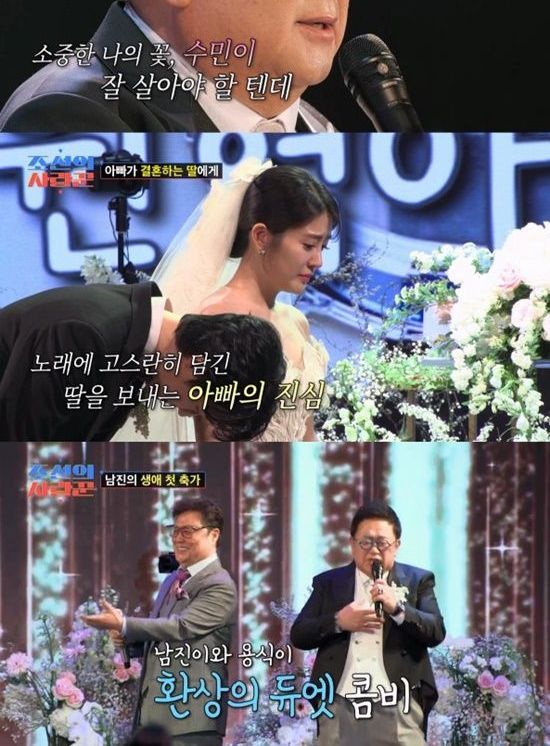 이어 '레전드 축가꾼' 남진이 데뷔 61년 만에 최초로 축가를 위해 무대 위로 올라왔다. 남진은 '가수 지망생'이었던 이용식의 데뷔 일화를 풀어 놓으며 이용식과 함께 '둥지'를 불러 결혼식장을 뒤흔들었다.