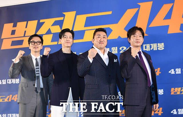배우 이동휘 김무열 마동석 박지환(왼쪽부터)이 연기 호흡을 맞춘 '범죄도시4'가 어린이날 황금연휴 동안 흥행 신드롬을 이어가며 누적 관객 수 850만 명을 돌파했다. /이새롬 기자