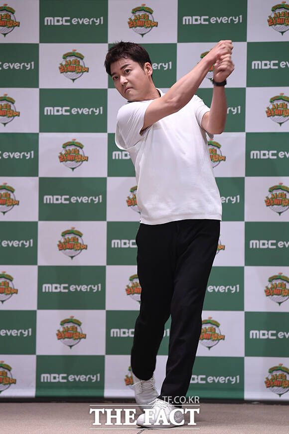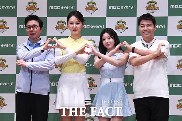 [더팩트ㅣ남윤호 기자] 방송인 김국진, 골퍼 문정현, 권은비, 전현무(왼쪽부터)가 7일 오전 서울 중구 앰배서더 서울 풀만 호텔에서 열린 '나 오늘 라베했어' 제작발표회에 참석해 포즈를 취하고 있다.