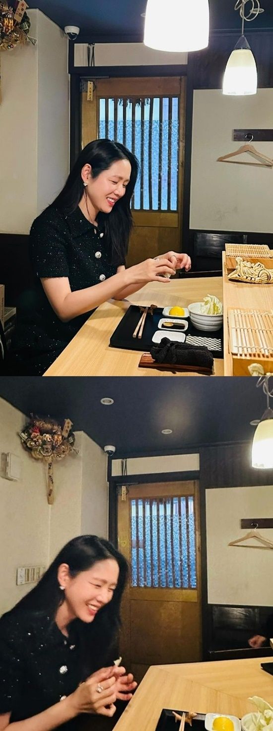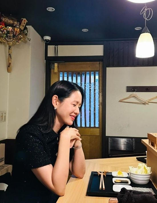 공개된 사진에는 식당을 찾은 손예진이 음식을 앞에 두고 환한 미소를 짓고 있는 모습이 담겨 있다.