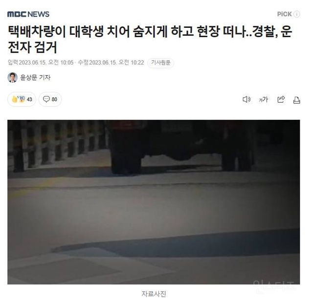 ?출처 :?택배차량이 대학생 치어 숨지게 하고 현장 떠나‥경찰, 운전자 검거 (naver.com)도로 위에 있던 대학생을 화물차로 치어 숨지게 한 뒤 달아난 혐의로 40대 택배기사를 붙잡았음하지만 택배기사는 사고를 낸 기억이 없다고 혐의를 부인하고 있다.근데 그 대학생은 도로 위 중앙분리대 주변에 서 있었다고 함ㅇㄴ 도로에 서 있어..,.사고를 낸 기억이 없다고 혐의 부인하는 것도 말이 안되긴 하는데새벽에 중앙분리대 주변에 서 있었다는 것도 말이 안됨…
