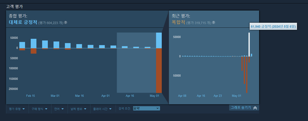 직전 ‘헬다이버즈2’의 누적 이용자 평가가 ‘복합적(약 54만 평가 가운데 44% 긍정적)’까지 추락했던 것을 고려할 경우, 기록적인 수준의 하락세만큼이나 빠른 회복세를 보이는 분위기다. 실제로 PNS 계정 연동 폐지 발표 다음날인 5월 7일에는 약 7만 6천여 신규 이용자 평가가 스팀 ‘헬다이버즈2’에 등록됐으며, 이중 6만 명 이상의 이용자들이 게임에 호평을 전했다.