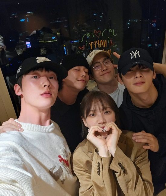 공개된 사진 속 아스트로 멤버 윤산하, MJ, 진진, 차은우는 문빈의 동생 문수아와 함께 활짝 웃으며 카메라를 향해 미소 짓고 있었다. 그중 아스트로 멤버들 사이에서 손하트를 하고 있는 문수아의 모습이 이목을 끌었다.