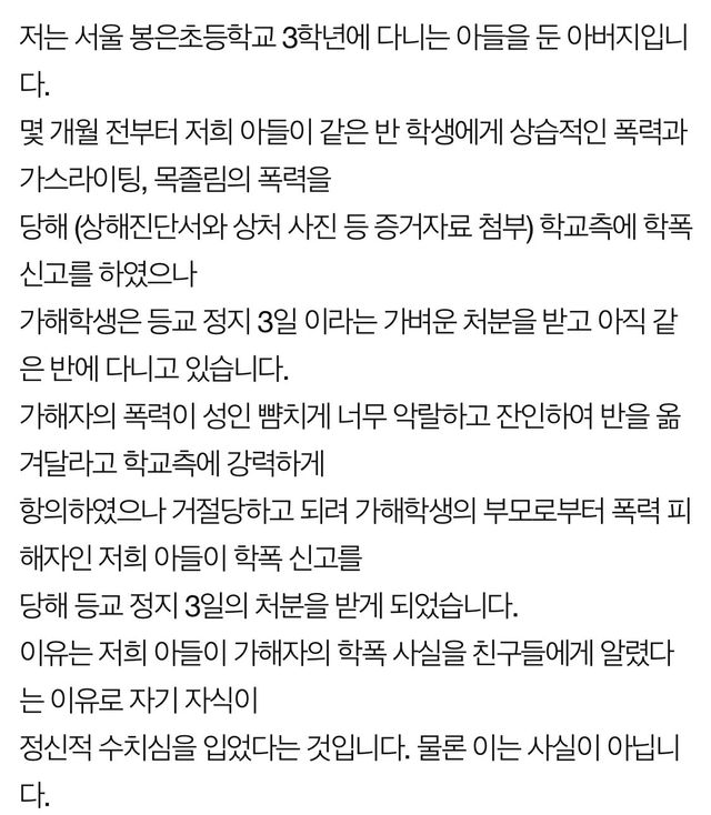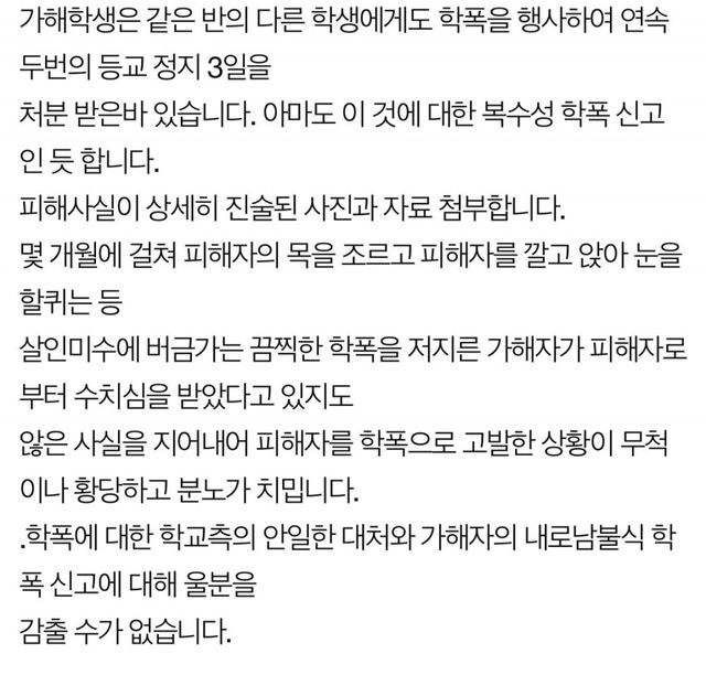 -수개월간 목을 조르고 눈가를 할퀴는 등 피해자가 상습적인 폭력을 당했는데도 사과는 커녕 피해자를 학폭 신고함