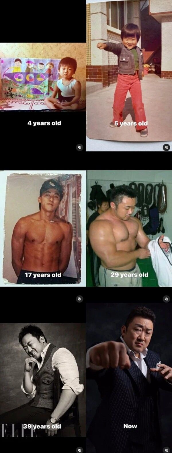 마동석은 5일 자신의 인스타그램에 "내가 어렸을 때"라는 글과 함께 사진과 영상을 게시했다. 공개된 사진과 영상 속에는 4살 시절부터 현재까지 다양한 모습의 마동석이 담겨 있다.