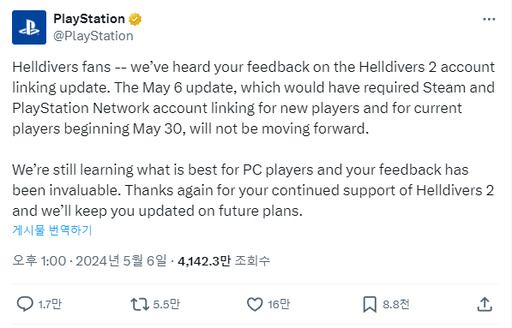 소니의 계정 연동 철회 발표 (출저= 플레이스테이션 공식 엑스 계정 캡쳐)