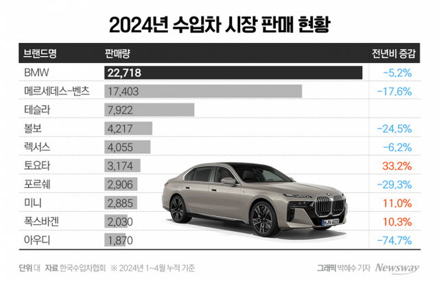아우디가 밀려나고 테슬라가 약진한 수입차 시장은 ▲메르세데스-벤츠 ▲BMW ▲테슬라 ▲볼보 ▲렉서스 중심의 5강 체제로 재편된 상황이다. 하지만 점유율이 높은 5강 업체들도 큰 폭의 판매 반등은 어려울 것이라는 전망이 지배적이다.