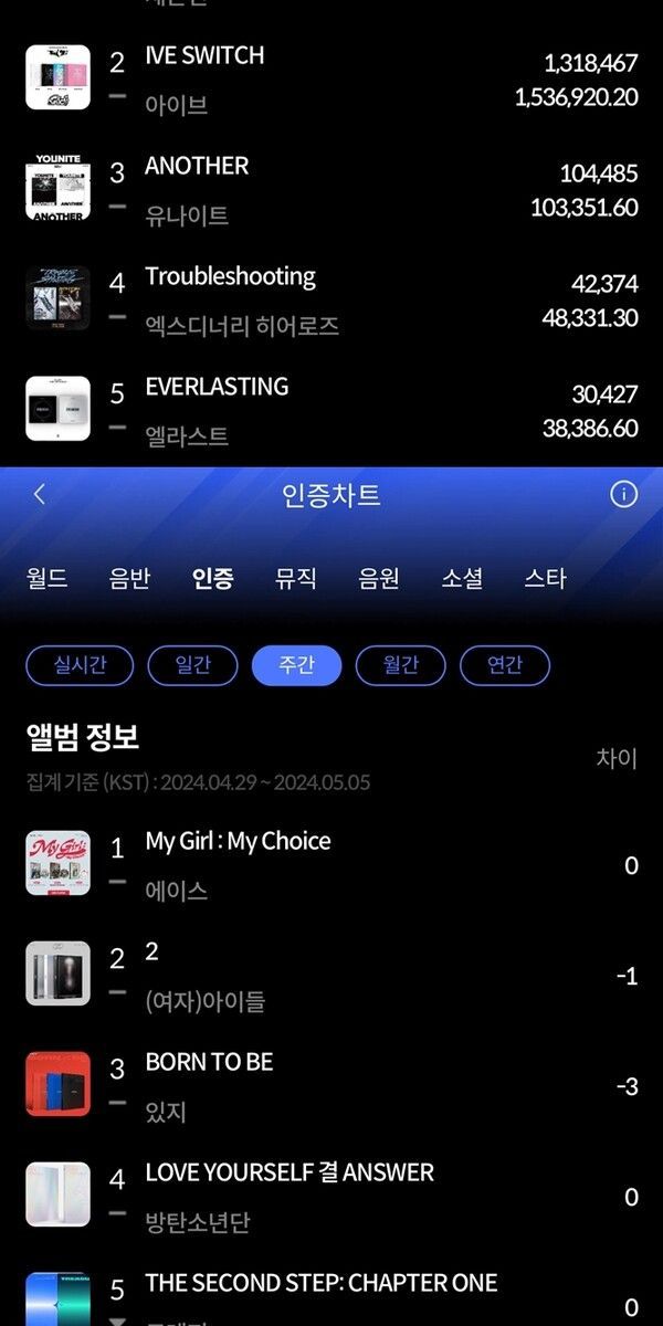 또, 주간 인증차트에서는 에이스에 이어 (여자)아이들의 정규 2집 '2'가 2위, 있지의 미니 8집 'BORN TO BE'가 3위를 기록했다.