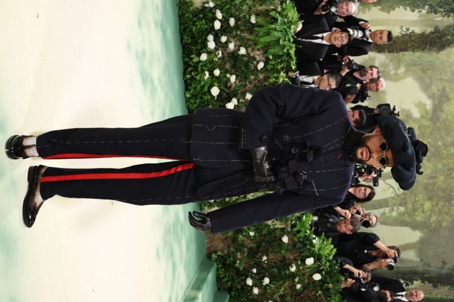 또 다른 공동 의장 배드 버니도 존 갈리아노가 제작한 메종 마르지엘라 아티즈널 비스포크를 입었습니다. 블랙 그로스그레인 깃과 이너 새틴 코르셋이 특징입니다.