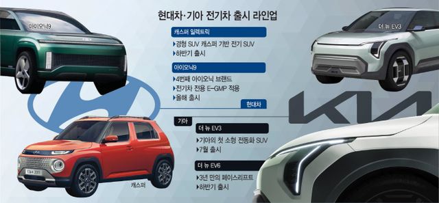 EV3를 출시하는 기아와 함께 현대차는 '가성비 전기차'의 일환으로 올해 안으로 경형 SUV 캐스퍼에 기반을 둔 '캐스퍼 일렉트릭'을 출시할 계획이다. 기존 캐스퍼보다 전장과 전폭이 커져 배터리 용량을 확보해 공간 활용성이 높아진다는 게 특징이다. 또 소형 전기차임에도 1회 충전 주행거리를 최대 350㎞ 이상 인증받겠다는 목표를 세운 것으로 알려졌다.