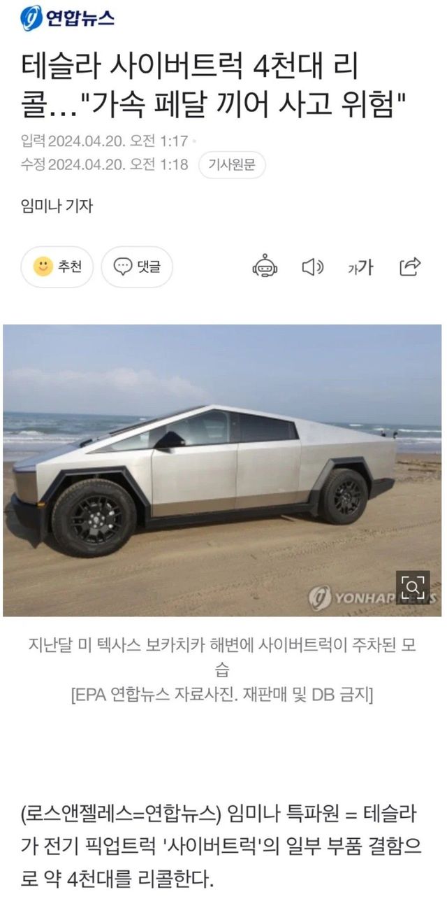 NHTSA는 "가속 페달 패드가 제자리에서 벗어나 내부 트림에 끼인 상태가 될 수 있으며, 이는 운전자가 의도하지 않은 가속을 유발해 충돌 사고 위험을 높일 수 있다고 설명했다.