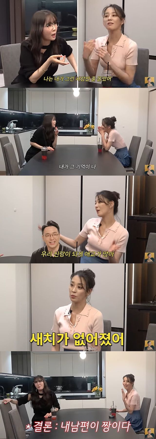 한고은은 "나도 내가 그런 사람인 줄 몰랐다. 우리 신랑이 애교가 되게 많다. 내가 그걸 보고 배운 거더라. 나는 남자가 귀염 떠는 거 정말 싫었다. 근데 이 사람이 하는 건 괜찮더라. 닮아가더라"라며 잉꼬부부 면모를 보였다.