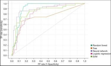 ROC곡선은 좌측 위 꼭지점에 가까울수록, ROC곡선의 아래면적(AUC)이 1에 가까울수록 좋은모델로 평가되는데 랜덤포레스트모델이 보상성 다한증 예측에 있어 우수한 결과값을 보여주고 있다.