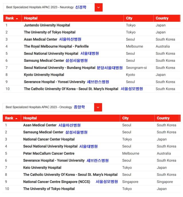 신경학을 제외한 전 분야에서 국내 병원이 1위에 올랐고, 내분비학, 신경학은 TOP10 중 6개가 한국 병원…