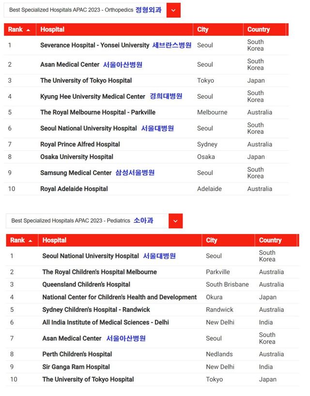 미국 시사주간지 뉴스위크에서 아시아-태평양 병원들을 분야별로 순위산출해서 발표했는데