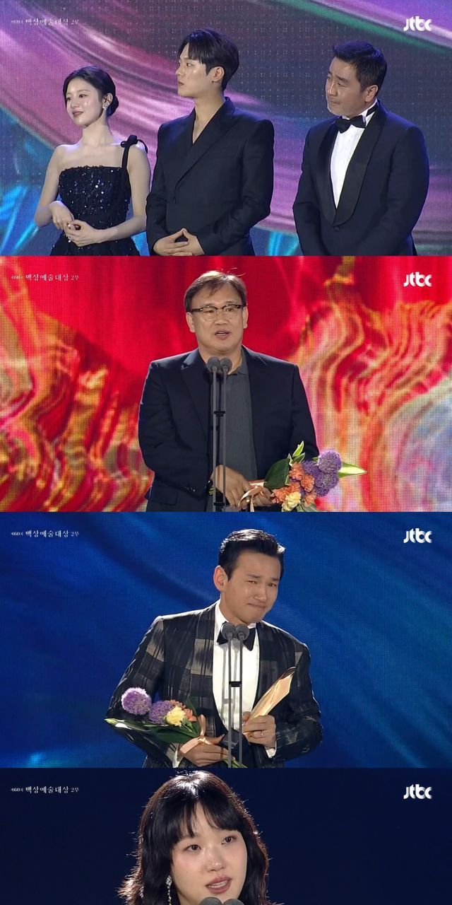 영화 부문 대상은 1312만명을 동원한 '서울의 봄' 김성수 감독이 거머 쥐었다. 김 감독은 "울화통 터지는 영화인데 주변에 추천해 주셔서 1000만명이 봤다. 한국영화를 사랑하는 모든 관객들께 감사드린다"고 인사했다. 그러면서 "제가 영화계를 대표하는 위치는 아니지만, 감히 말씀 드리겠다. 저를 포함해 한국영화를 만드는 모두가 더 열심히, 재미있게, 정성들여 만들도록 노력 하겠다. 영화인들 같이 힘내자"고 말해 훈훈함을 안겼다.
