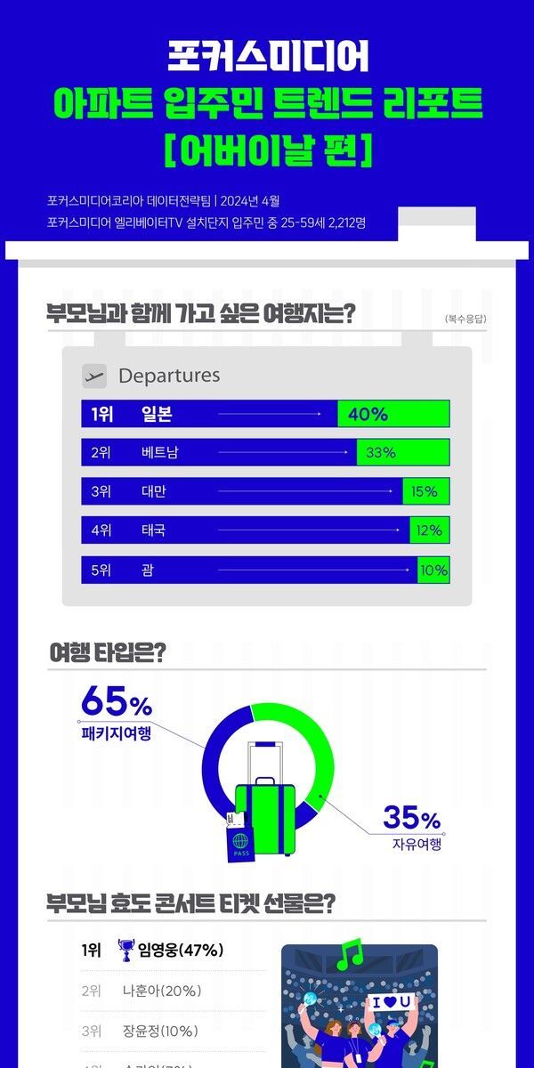 부모님 효도 여행지는 엔화 약세로 전 세계 관광객이 몰리는 일본(40%)이 1위를 차지했다. 패키지 관광으로 인기가 높은 베트남(33%)은 2위, △대만(15%) △태국(12%) △괌(5%)이 3~5위였다. 아파트 입주민은 효도 관광을 떠날 때 자유 여행(35%)보다 패키지 여행(65%)을 두 배 가까이 더 선호하는 것으로 나타났다.