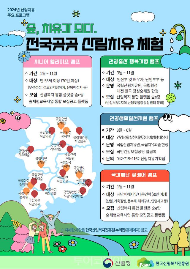 올해 산림청과 한국산림복지진흥원은 국민건강 증진을 위해 전국 치유의 숲에서 산림치유프로그램을 운영한다. 난임부부, 경증 치매환자, 재난 피해자 등을 대상으로 △건강 출산 행복가정 캠프 △시니어 웰라이프 캠프 △국가재난 숲케어 캠프 등 특색있는 산림복지 서비스를 제공할 예정이다.