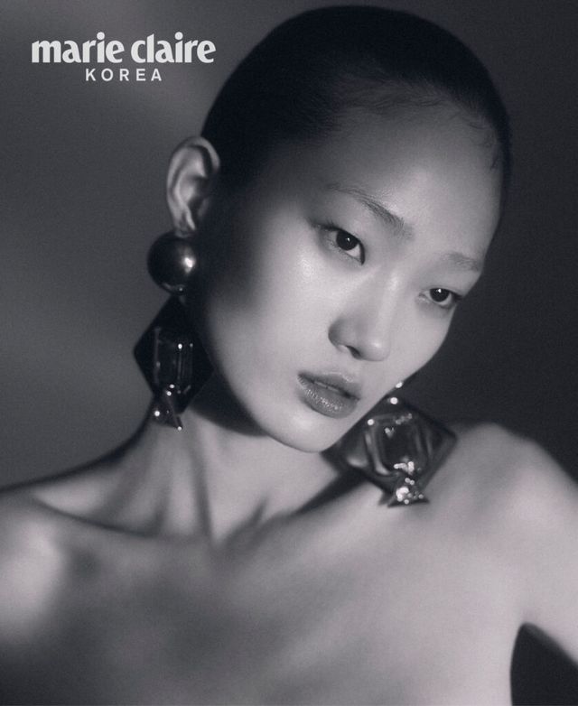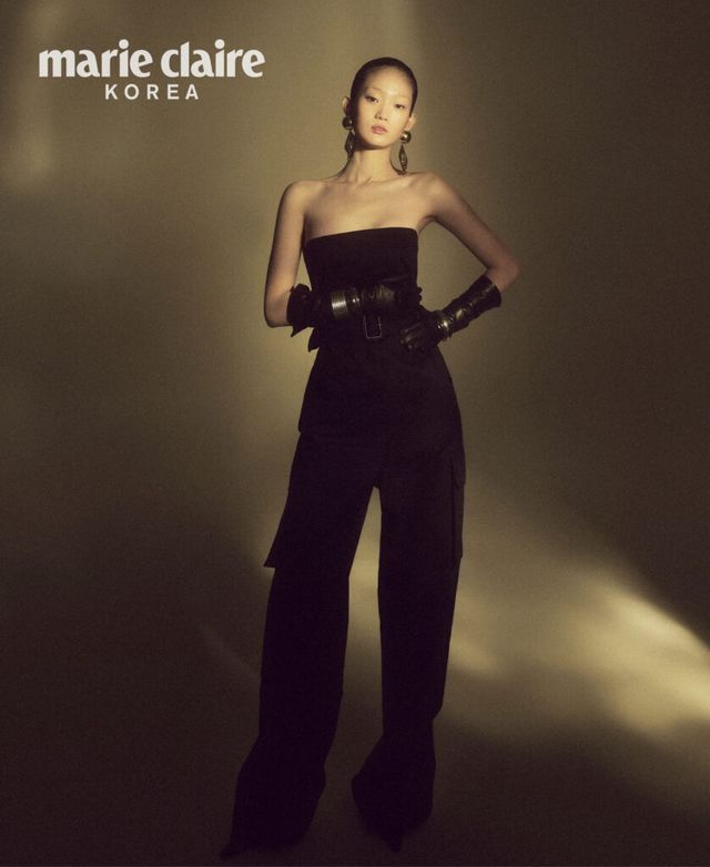 오프숄더 점프수트, 가죽 장갑, 귀고리, 볼드한 뱅글들, 슈즈 모두 가격 미정