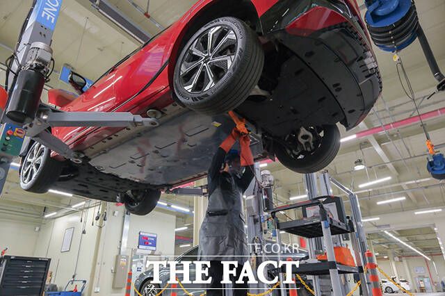[더팩트ㅣ장윤석 기자] 세계 최초 'EV∙PHEV 정비 부문' 2년 연속 티유브이슈드 인증을 기념해 7일 오후 인천 서구 오토플러스 직영 리컨디셔닝센터 ‘ATC’에서 전문 정비 전문가가 전기차 점검 시연을 하고 있다.