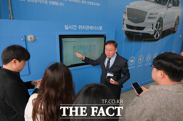 박종호 생산본부장이 ATC 내 실시간 위치관제시스템을 소개하고 있다.