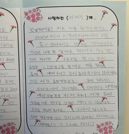 공개된 사진 속 손편지는 "I Love you"라고 꾸며져 있는 편지지에 종이 카네이션을 붙인 귀여운 모양이었다.