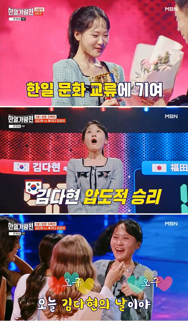 김다현은 지난 7일 방송된 MBN ‘한일가왕전’ 최종회에서 실력파 선배들과 일본 대표들과 경쟁 끝에 김진표 국회의장으로부터 우승컵을 전달받고 미소를 머금었다.