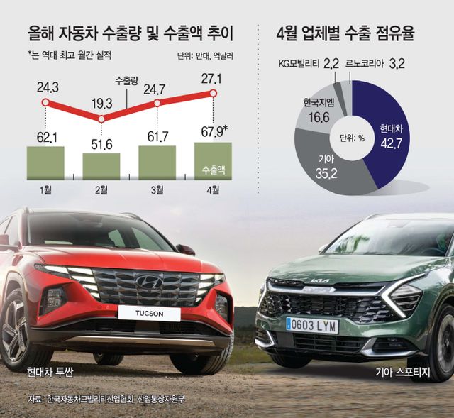 이 같은 자동차 수출의 상승세는 현대차·기아가 견인하고 있다. 지난달 수출 대수 27만1147대 기준으로 현대차·기아의 비중은 각각 42.7%·35.2%였다. 국내 수출 차량 10대 중 8대는 현대차그룹이 담당하고 있는 셈이다.