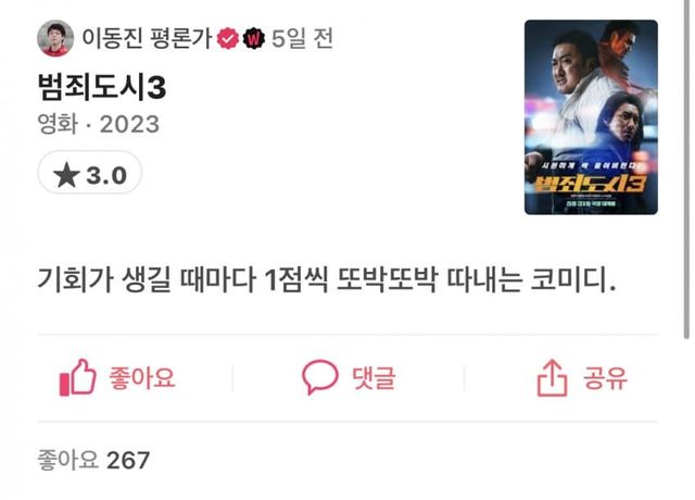 참고로 이동진 평론가는 모든 범죄도시 시리즈에 3점을 줬었음