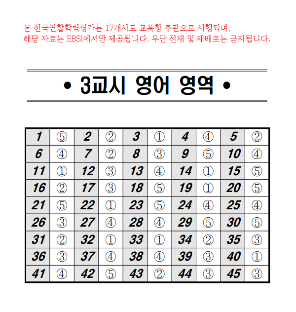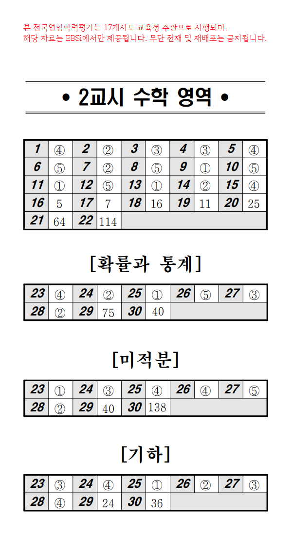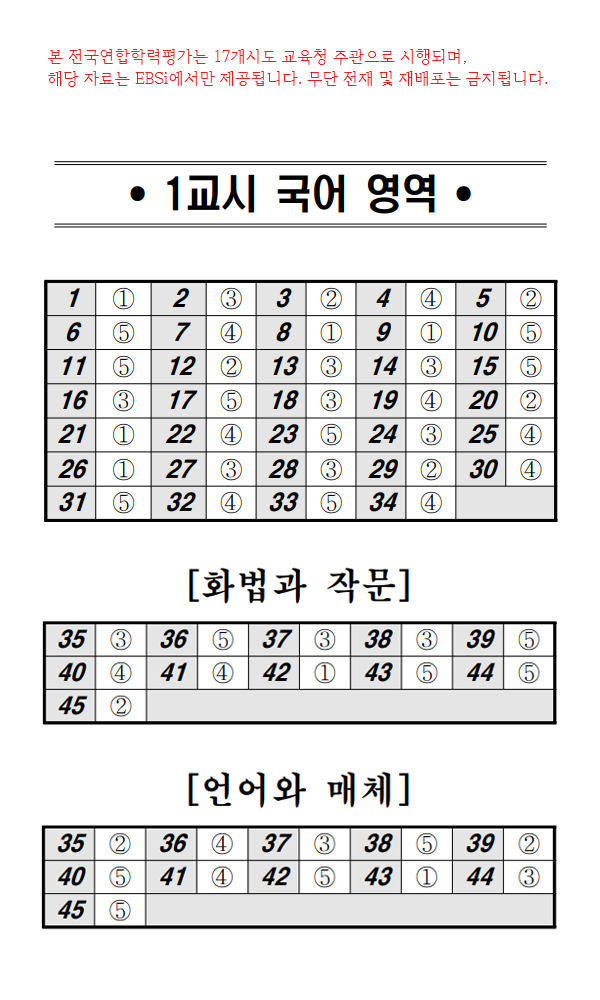다음은 2024년 5월 모의고사 국어, 수학, 영어 정답 답지다.