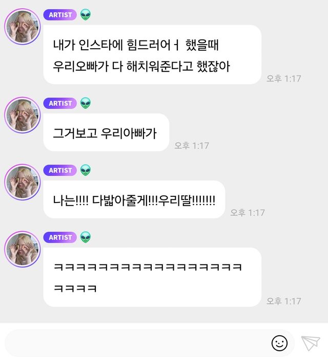 이와 함께 윈터는 "그거 보고 우리 아빠가 '나는!!!! 다 밟아줄게!!! 우리딸!!!!!!!"이라면서 부친에게 받은 응원메시지도 공개했다.