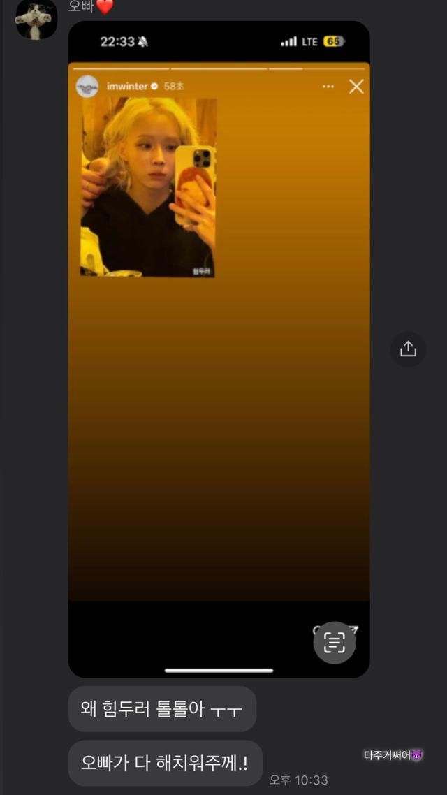 앞서 그의 오빠는 윈터가 "힘들다"는 글을 남기자 "왜 힘들어 톨톨아ㅜㅜ 오빠가 다 해치워줄게.!"라는 글을 남기며 응원 메시지를 보낸 바 있다.
