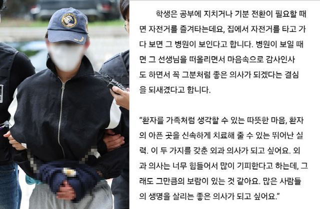 이 인터뷰에서 최씨는 의대를 지원한 이유에 대해 “석해균 선장과 귀순 병사 치료로 주목을 받았던 이국종 교수님이 롤모델”이라며 “환자를 가족처럼 생각할 수 있는 따뜻한 마음, 환자의 아픈 곳을 신속하게 치료해 줄 수 있는 뛰어난 실력. 이 두 가지를 갖춘 외과 의사가 되고 싶다”고 밝혔다. 이어 “많은 사람들의 생명을 살리는 좋은 의사가 되고 싶다”고도 했다.