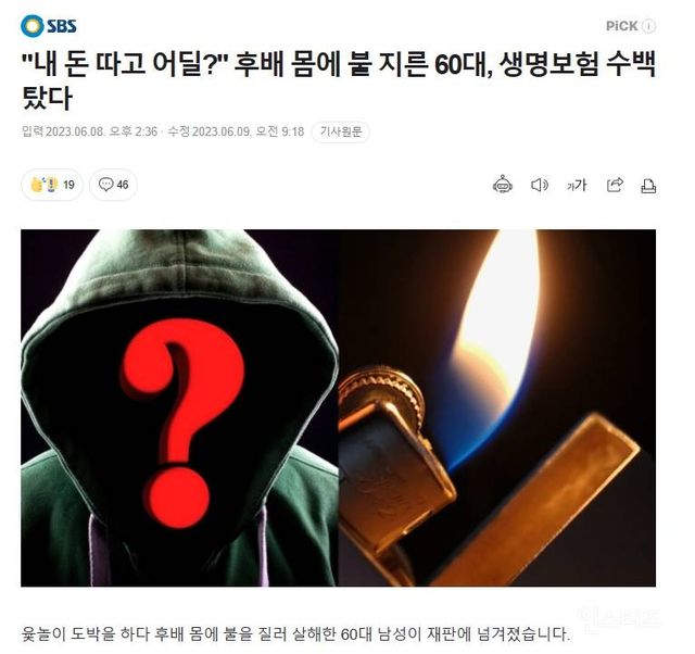 출처 : “내 돈 따고 어딜?” 후배 몸에 불 지른 60대, 생명보험 수백 탔다 (naver.com)