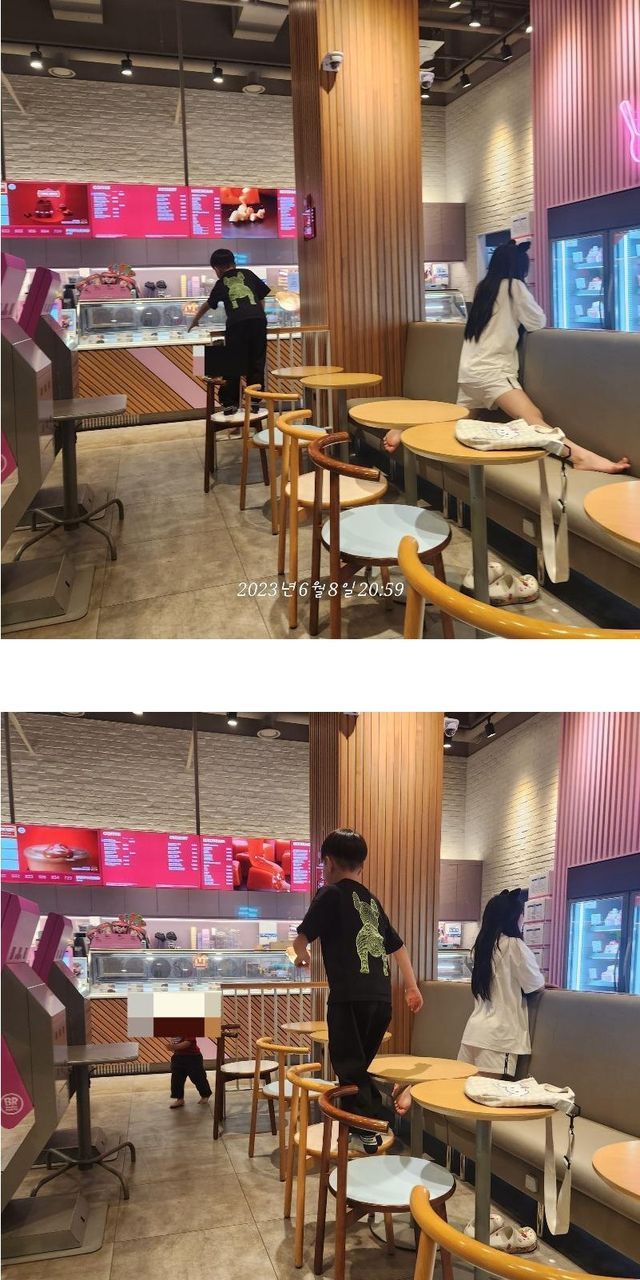 가족과 함께 베스킨 매장을 방문했지만 이 진상가족들은 진상인지 모른체 이렇게 놀고있더군요 그래서 엄마란 사람 에게 애들 관리 를 부탁 했으나 들은체도 안한체 하지마~한마디 하고 계속 뛰어놀게 놔두고 주문한 아이스크림이 나올때까지 기다리고 있더군요 동영상을 못찍은게 너무 아쉽네요 매장에는 알바생 과 손님이 있었는데 제 딸도 이렇게 뛰어 놀게 했어야 했나요?
