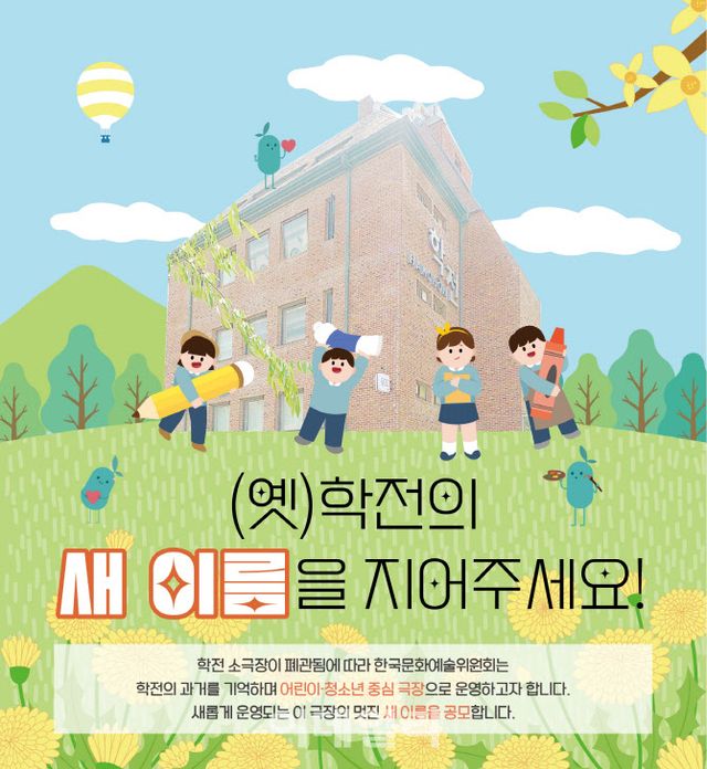 옛 학전의 ‘대국민 극장명 공모전’은 국민 누구나 참여할 수 있으며 9일부터 17일까지 온라인으로 신청서를 제출하면 된다. 보다 자세한 내용은 예술위 홈페이지와 SNS에서 확인할 수 있다.