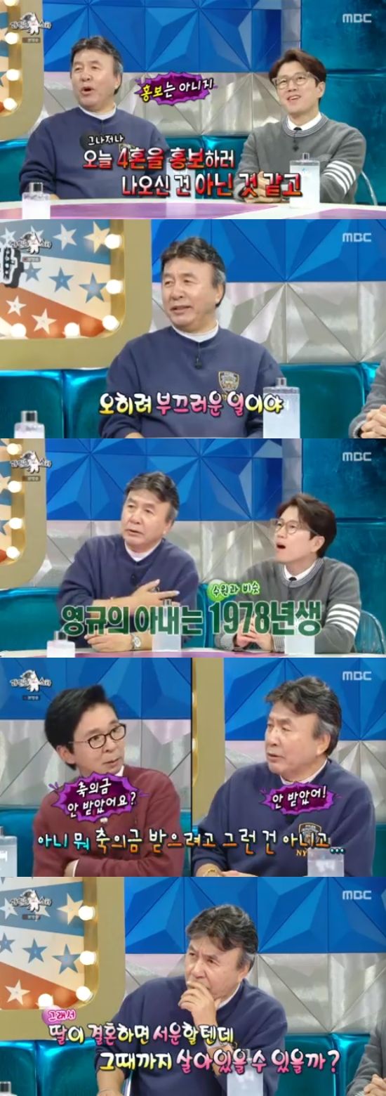 박영규는 "4번째 결혼에 제 지인들도 '더이상 헤매지 말고 잘 살아라'고 하더라. 4번째니까 결혼식 축의금도 안 받았다"고 했다. 또 자동차를 선물하며 프로포즈를 했다는 박영규는 "내가 그렇게 돈이 많은 건 아닌데, 이것만큼은 무리해도 되겠다 싶어서 그렇게 했다. 일시불로 샀다"고 전했다.